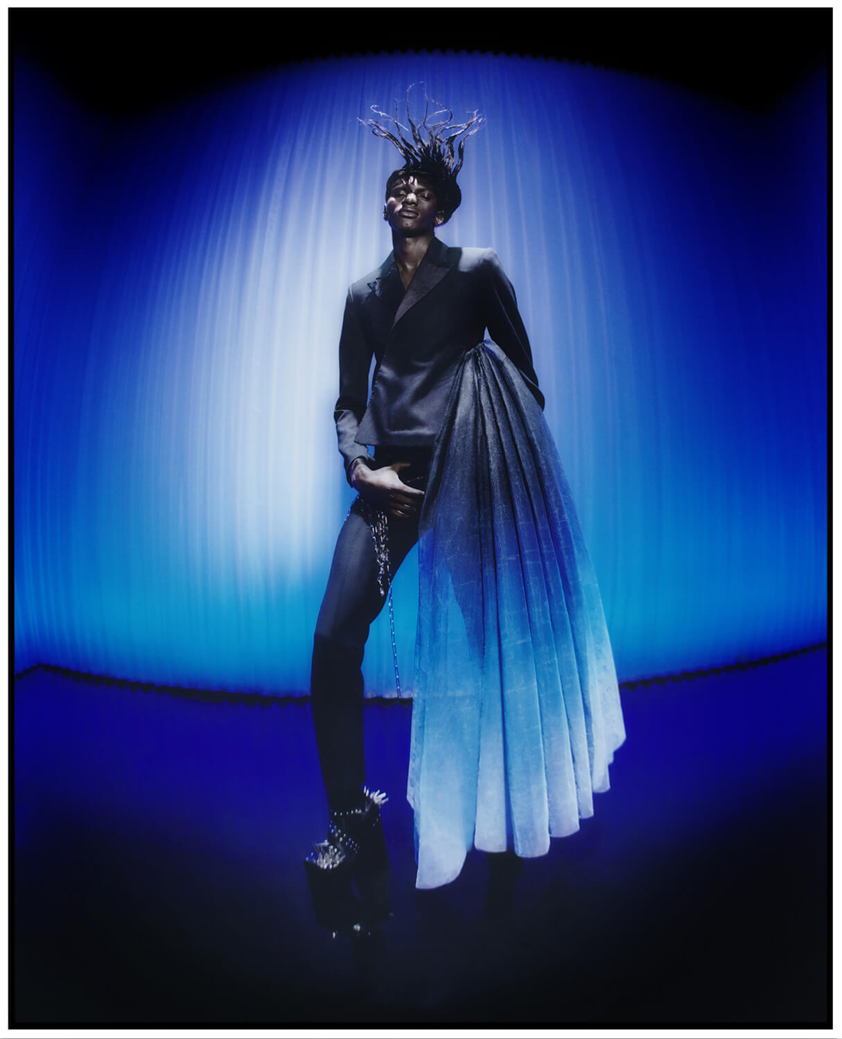 Demi-couture gowns are finished with headpieces created in collaboration with Vivienne Lake that take their inspiration from punkish mohawks, but instead come realised in peacock plumes. Custom ROKER boots provide the footwear, a striking contrast set against the romanticism of the tulle and the masculinity of the tailoring.