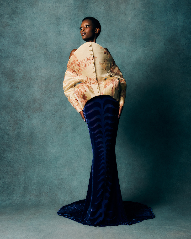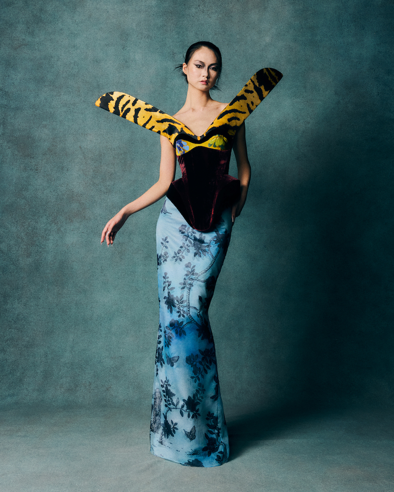 Having previously collaborated with luxury wallpaper experts Fromental by repurposing their archive silks, Reed was keen to explore their artistry with textiles further and collaborate on bespoke fabrics for the collection. Archival Nottingham lace was the inspiration for a new landscaped lace print featured on a blue duchess bodice with chenille silk embroidery, and in pink silk on a fan shaped corset top with curved sleeves. Lilac and chartreuse duchess satins were gestural painted with a wisteria design and gilded with gold tendrils and fine silk embroidery on skirts and trims, and abstract tortoiseshell and tiger patterns were hand painted by fine artists and printed on to layers of silk, chiffon and duchess creating a contrast in scale and intricacy. Existing Fromental designs were hand painted, hand embroidered, and gold leafed across the collection, whilst velvets appear either brushed and bruised, or as fluid devoré achieving an overwhelming richness of texture.