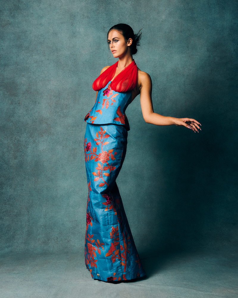 For Reed, the designs always begin with the silhouette, exaggerating and embellishing the human form and playing with proportions through corsetry, caging, and an excess of drapery and texture. A tailored suit with flared trousers built out at the hips and a corseted jacket cinching impossibly at the waist and flaring wide at the shoulders works to completely transform the body’s proportions, whilst corsets branch out from the core of the body, extending like wings. The brand’s signature crinolines are employed to create voluminous mermaid skirts before being exposed and contorted, as if caught mid dance, and finally reworked into a form of chest-plate armour in red grosgrain ribbon.